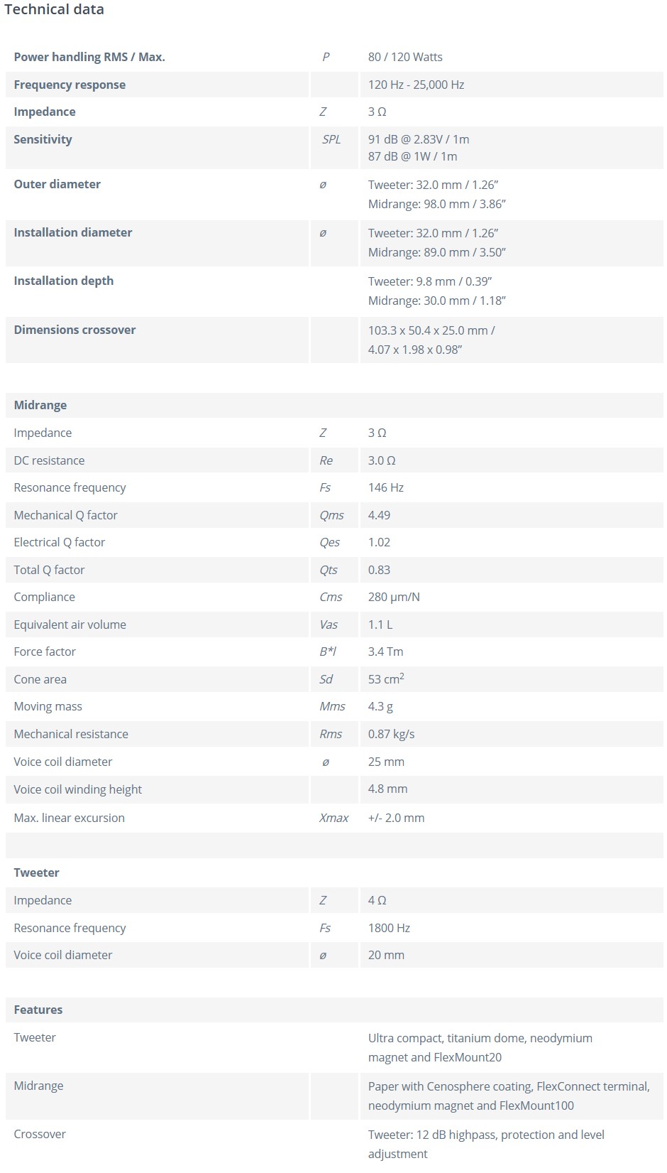 120Hz ~ 25KHz , 3Ω , 91db